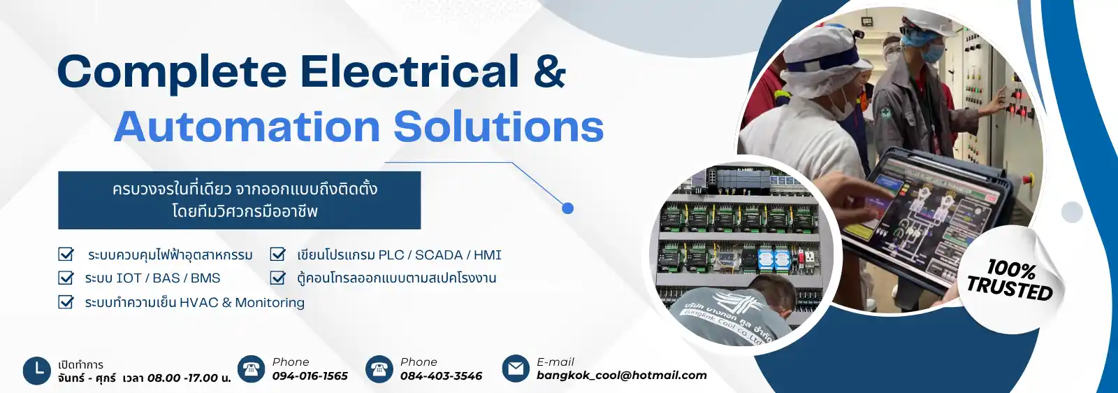 ผู้เชี่ยวชาญระบบปรับอากาศ ไฟฟ้า และระบบอัตโนมัติอุตสาหกรรม ให้บริการออกแบบ ติดตั้ง PLC, IoT, SCADA, HMI, BAS/BMS และตู้ควบคุม พร้อมระบบ Monitoring & Energy Management โดยทีมวิศวกรประสบการณ์กว่า 10 ปี